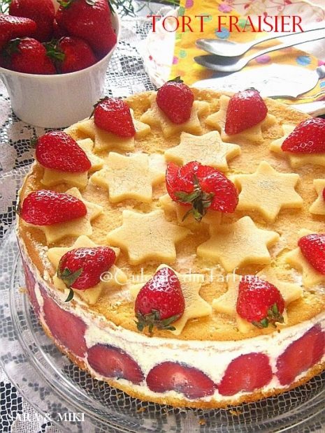 Tort Fraisier, un tort francez (Le Fraisier) incredibil de bun facut din blat, crema de vanilie cremoasa si plin de capsuni proaspete. Aceasta reteta este rapida, usoara si foarte reconfortanta. Versiunea clasica este cu crema de vanilie si unt (crème mousseline). La acest tort am folosit un amestec de crema de vanilie, frisca si gelatina (crème diplomat). Pe baza acestei retete se pot realiza si alte versiuni cu alte fructe, cum ar fi caise, zmeura etc …