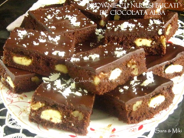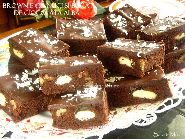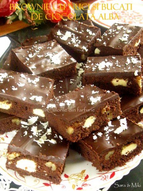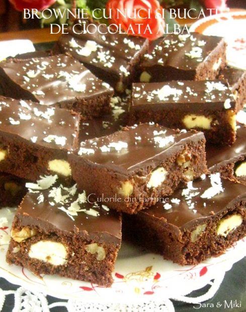 Brownie cu nuci si bucati de ciocolata alba o minunatie de prajitura. Ingredientele de baza necesare pentru a face brownie sunt zahar, oua, faina, unt si ciocolata. Reteta este cunoscuta si cu fructe, coaja de fructe, nuci sau bucati de ciocolata alba.