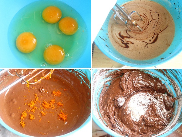 Se adauga si ciocolata racita si optional, zeama si razalitura de la o portocala. La urma se incorporeaza, cacao si faina cernute.