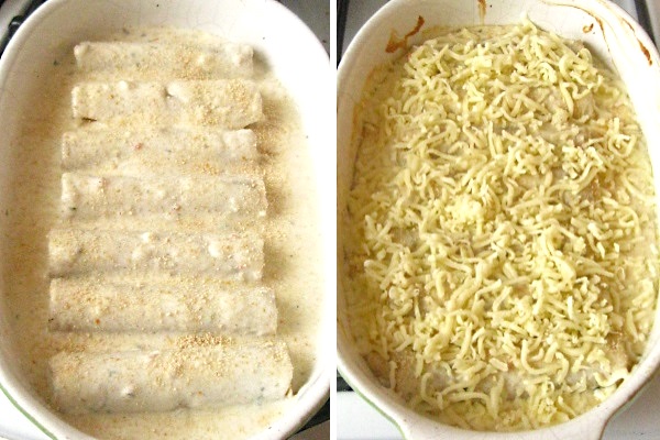 Intr-un vas pentru cuptor se pune un strat din sosul bechamel si se aseaza deasupra cannelloni umpluti cu compozitia de carne. Se acopera cu restul de sos. Pe deasupra se presara putin pesmet fin si parmezan sau cascaval ras.