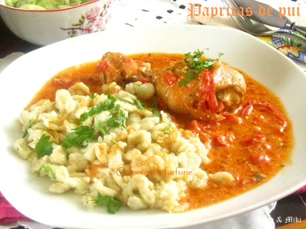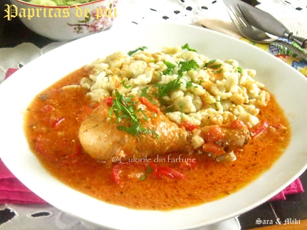 Papricasul de pui este o mancare traditionala ungureasca, noua ne place mult. Este foarte usor de realizat. Se serveste cu Nokedli, niste galuste mici din faina, consistene, servite alaturi de tocanite de carne sau legume si care inlocuiesc cu succes orezul, ca garnitura la felurile principale.