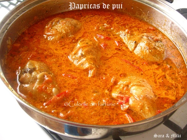 La reteta de baza carnea se fierbe in sosul de papricas. Eu am dat totusi o crusta pulpelor de pui inainte.