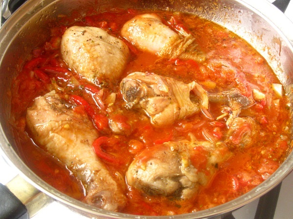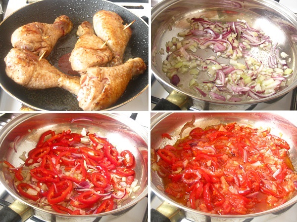 Dupa ce se prajeste in putin ulei pulpele, separat in alta cratita cu ulei curat se pune ceapa rosie si alba taiata cuburi sau feliute. Se adauga si usturoiul si se distuie totul fara sa se arda ci doar pana devine sticloasa.