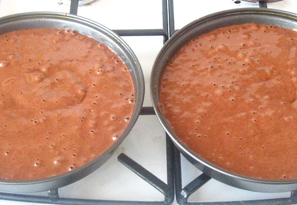 Impartim compozitia in mod egal in 2 tavi de Ø 20/21 cm, unse cu ulei iar pe fund tapetate cu hartie de copt.