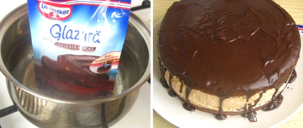 Acoperim cu cel de al doilea blat si dam la rece cat topim glazura de ciocolata.