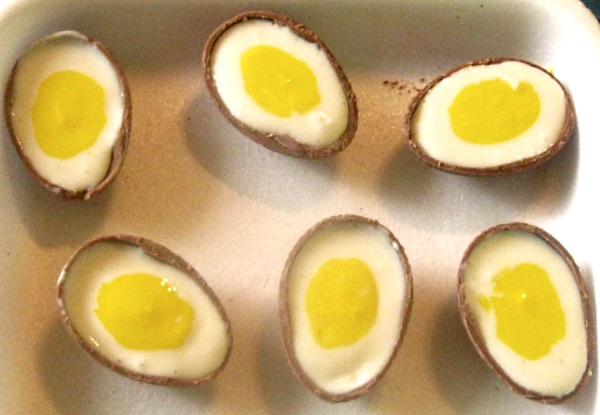 Ouale de ciocolata se taie in jumatate cu un cutit zimtat pe semnul care il are deja oul.