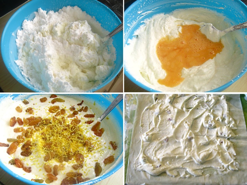 Pregatim compozitia de branza: intr-un bol se amesteca branza dulce, zaharul pudra si 3 oua batute cu o furculita. Cand s-au omogenizat se adauga coaja rasa de la o lamaie si stafidele. Stafidele isi trag umezeala din compozitie , deci nu trebuiesc tinute la inmuiat, doar daca nu doriti sa le tineti in alcool.