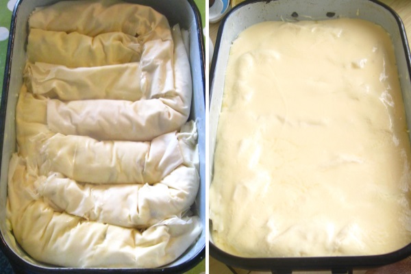 Procedam la fel pana terminam foile si compozitia. Vor iesi 6 suluri, eu un sul l-am taiat pe jumatate ca sa incapa bine in tava. Stropim totul cu untul ramas, daca va ramane.