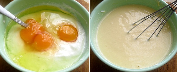 Pregatim aceasta compozitie: intr-un bol se amesteca cu un tel iaurtul cu cele 3 oua, zaharul pudra si esenta de vanilie. Se toarna amestecul deasupra si se scutura tava ca sa patrunda lichidul peste tot ca-n poza de mai sus.