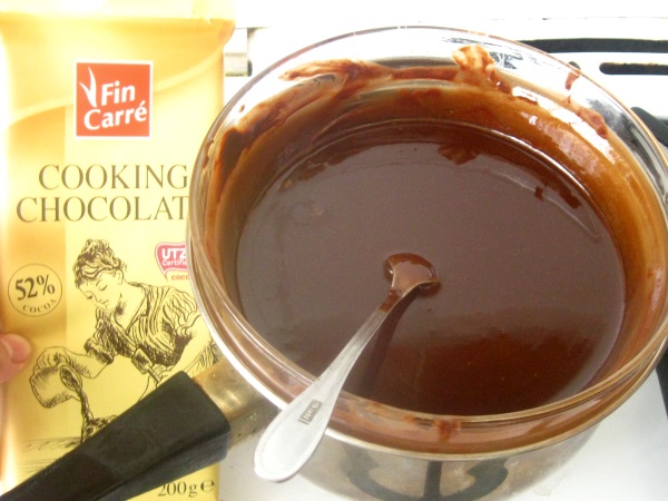 Ciocolata se rupe bacati si impreuna cu cacao si untul se pun intr-un bol aseazat intr-un vas cu apa calda pe foc, adica la bain-marie. Se amesteca pana se topeste si ciocolata si untul. Se ia bolul de pe foc si se lasa 5-8 minute sa se raceasca.