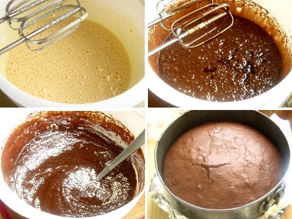Se tapeteaza un vas Ø 21 cm cu hartie de copt si se toarna compozitie. Se lasa in cuptorul incins cca. 35 de minute la 170 °C sau pana trece testul cu scobitoarea.