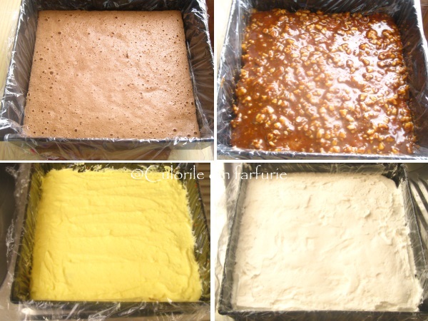 Asamblarea: Vasul de copt se tapeteaza cu folie de plastic si se aseaza blatul. Se intinde deasupra lui sosul caramel, cat este caldut ca sa poata fi bine intins pe toata suprafata. Se da la rece 15-20 minute sa se raceasca bine caramelul.