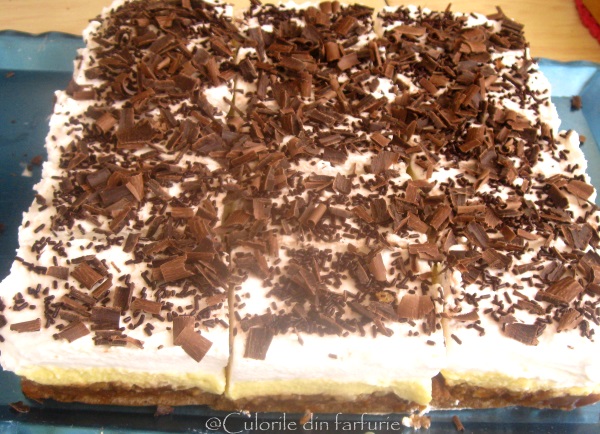 La servire scoatem prajitura din tava, ajutandu-ne de folia de plastic. O portionam si adaugam ca decor cipsuri de ciocolata sau radem ciocolata.