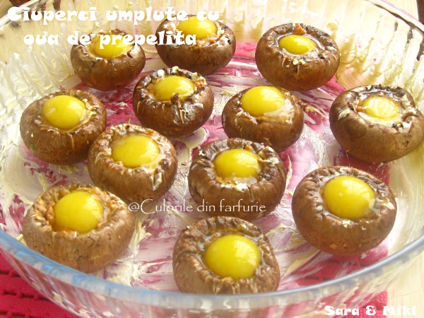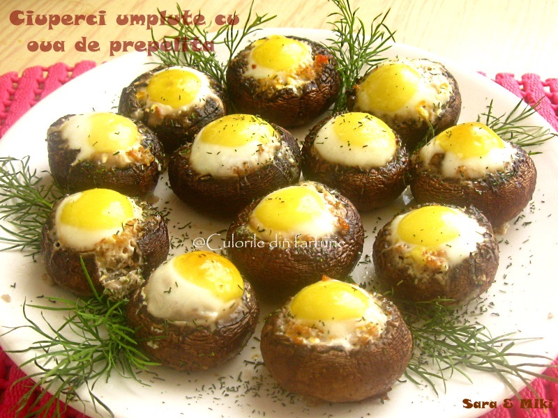 Ciuperci umplute cu oua de prepelita, o mancare ce poate fii servita simpla, pe post de carne langa un orez si o salata alaturi sau drept garnitura.
