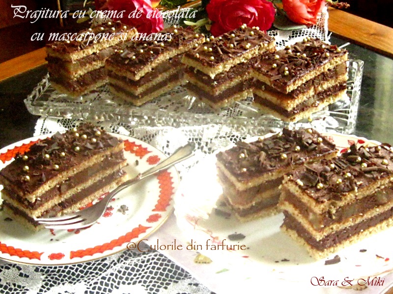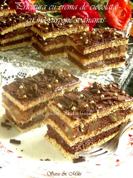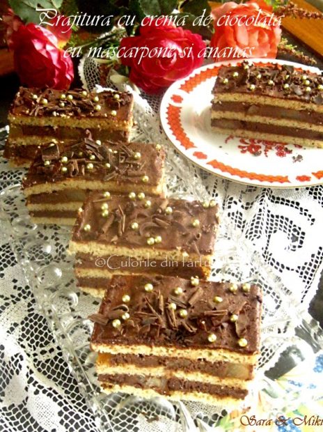 Mi-am gasit reteta preferata de prajitura cu crema de ciocolata si mascarpone si trebuie sa recunosc ca este absolut delicioasa! Combinatia de arome dintre ciocolata topita si mascarpone este pur si simplu perfecta, iar bucatile de ananas din compot adauga un gust dulce-acrisor care echilibreaza perfect totul. Trebuie sa incercati aceasta prajitura minunata, cu siguranta nu veti regreta! Multumim pentru reteta, abia astept sa o savurez din nou!