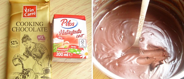 Ciocolata se rupe in bucati si se adauga in frisca lichida incalzita pe foc intr-un vas. Se amesteca pana se topeste complect si devine fluida. Se da apoi la rece pentru 2-3 ore.