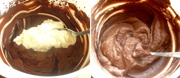 Se incorporeaza si crema de ciocolata, amestecand cu miscari ample.