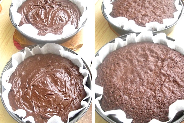 Turnam aluatul in 2 forme de 20 cm tapetate cu hartie de copt si le coacem la 180°C, pana trec testul scobitorii (in jur de 30-35 minute).