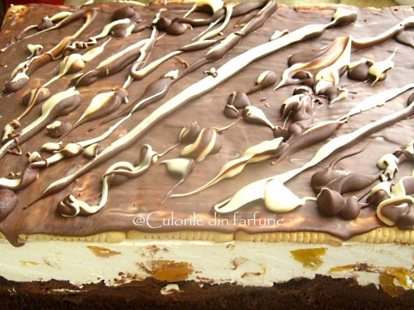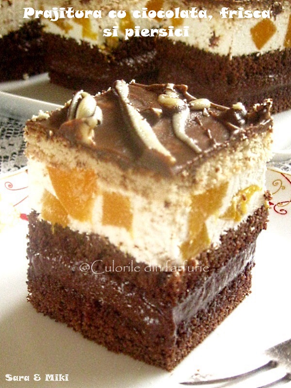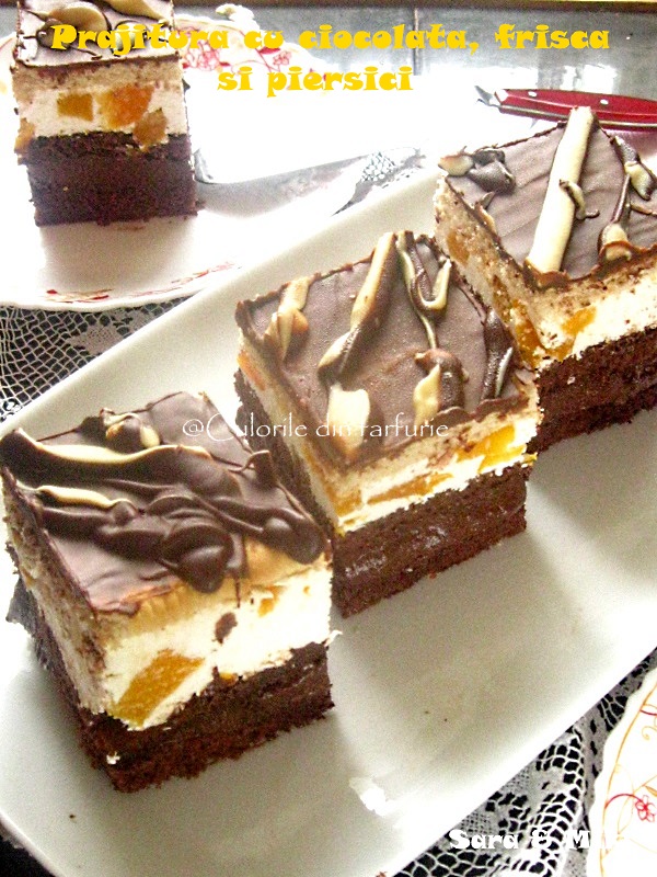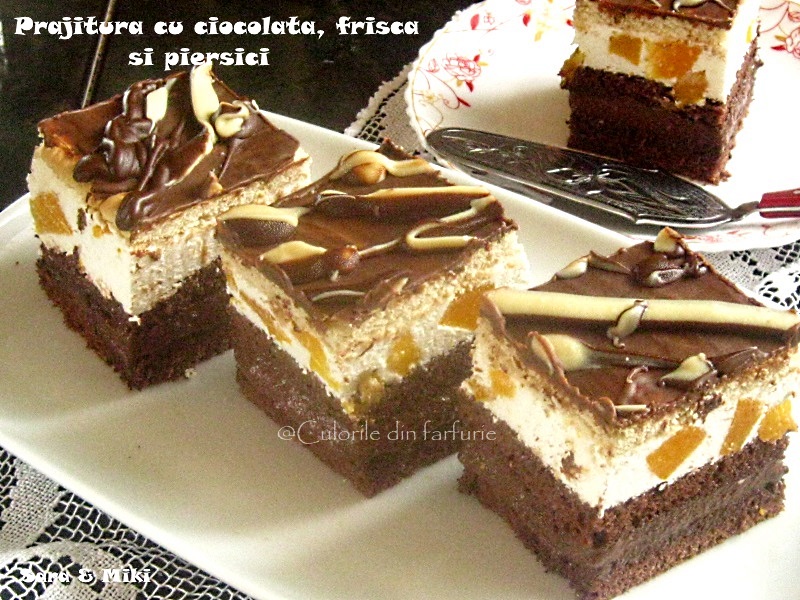 Prajitura cu ciocolata, frisca si piersici o prajitura ciocolatoasa si racoritoare de la frisca si fructe. Oarecum seamana cu Prajitura Ambasador foarte indragita de voi, dupa accesarile care le are.