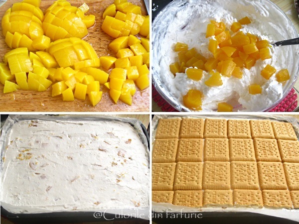 Piersicile se taie in cuburi de cca. 1 cm si se incorporeaza in frisca. Se lucreaza rapid ca sa nu se intareasca frisca, asa ca se intinde peste prajitura din tava. Se aseaza deasupra un rand de biscuiti cu unt.