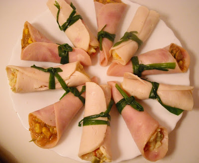 Cateva frunze de ceapa verde se oparesc si se taie in 2 pe lung. Rezulta niste fasii verzi cu care legam rolurile de sunca. E si practic si estetic.