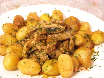 Cartofi noi cu carne de vita si ciuperci in sos de ardei