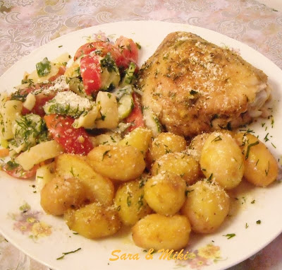Friptura de pui cu cartofi noi si salata