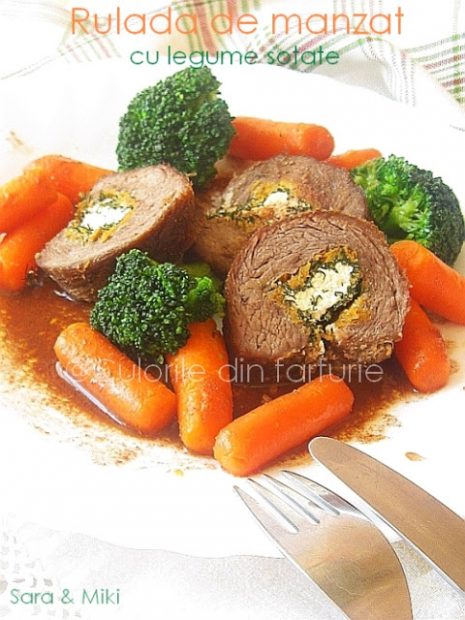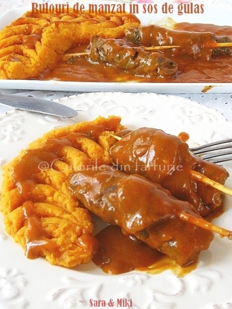 Manzatul este un vitel castrat cu varsta pana la 3 ani, de aceea carnea sa este foarte frageda si trebuie sa aiba culoarea de un rosu viu. Preparatele sunt fine si rafinate. Sper sa va placa aceste Rulori de manzat fierte in sos de gulas, alaturi de un piure de cartofi dulci.