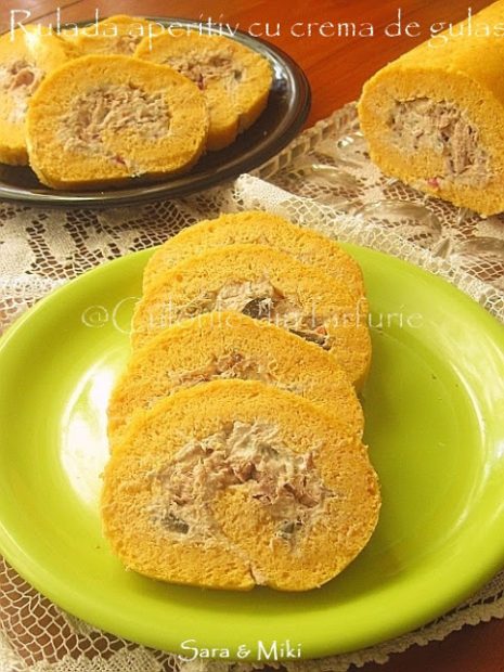 Crema de gulas este baza de mancare pentru gulas si se gaseste in orice supermarket in tuburi sau la borcanele. Culoarea portocalie a acestei rulade este data tocmai de aceasta crema. Aceasta Rulada aperitiv este asemanatoare cu Rulada de spanac si crema cu ciuperci, porumb, rosii uscate.