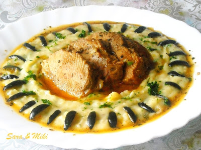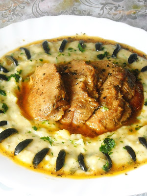 Carnea feliata se serveste cu orice fel de garnitura si cu sucul propiu alaturi. Eu am facut un piure de cartofi.